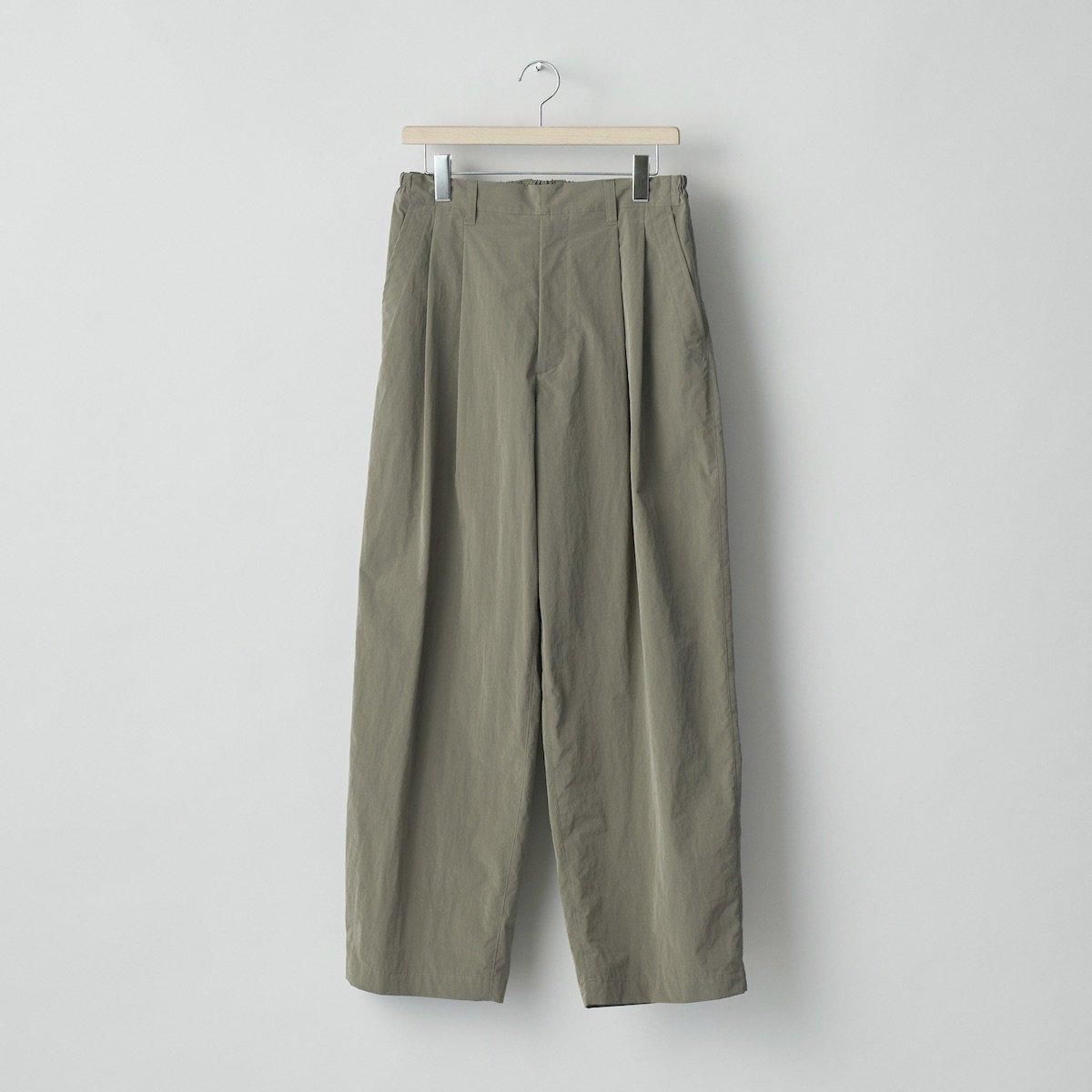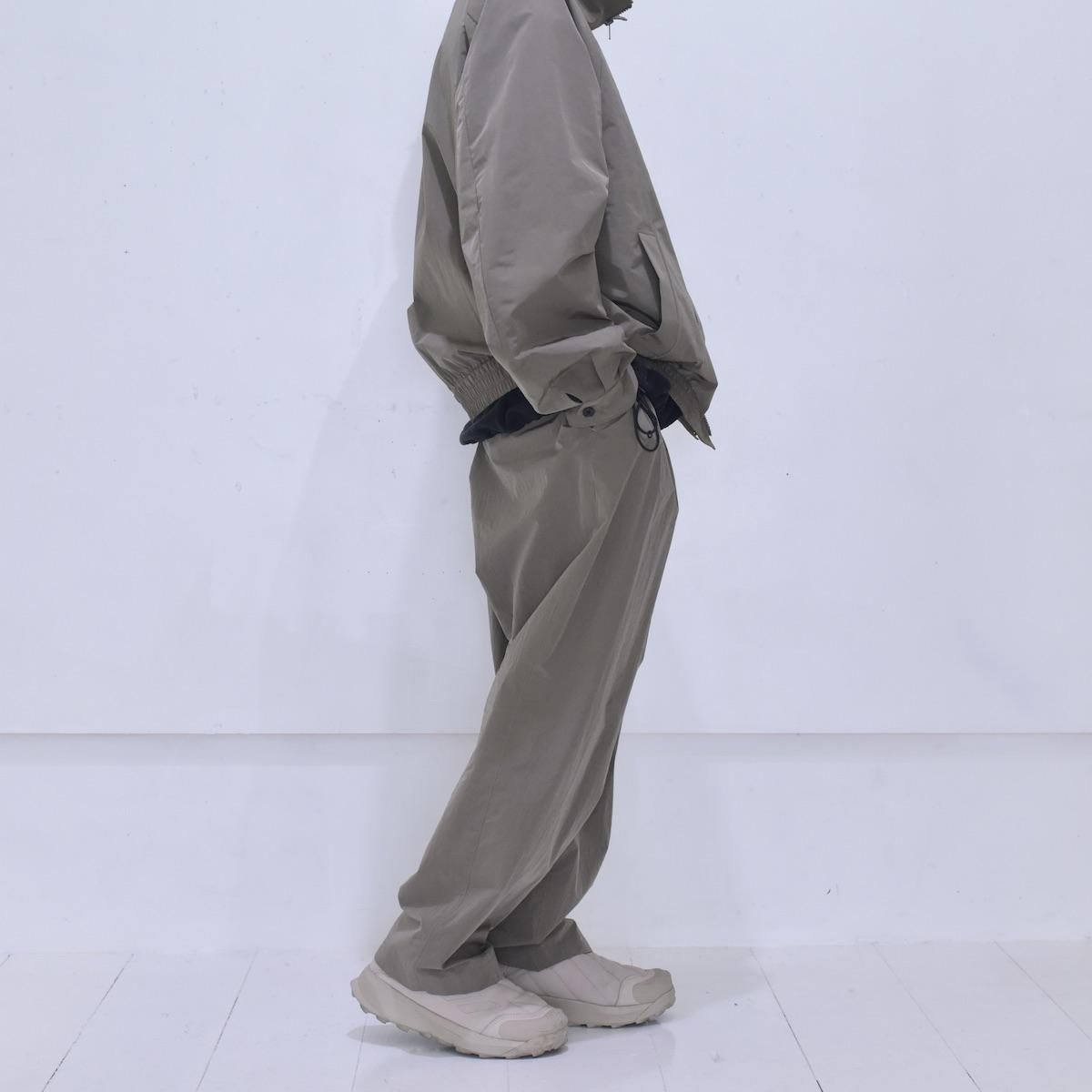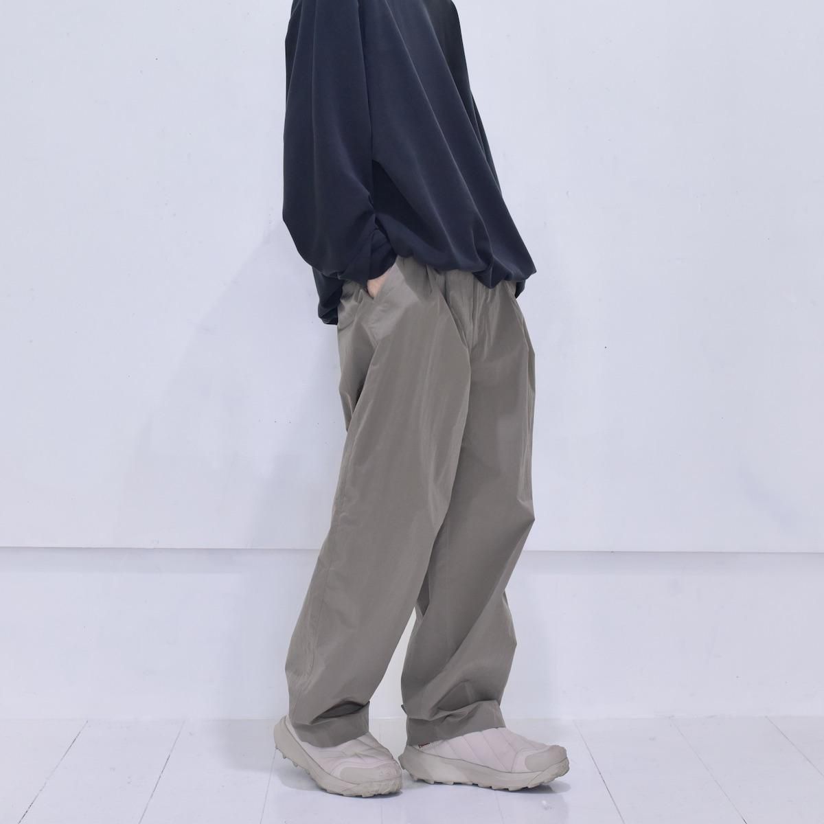 洗いが施されシワや膨らみのある表情に仕上げた"Windproof Nylon Wide Easy Trousers"。