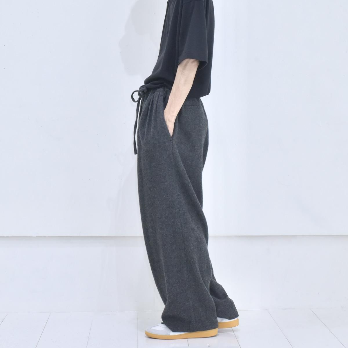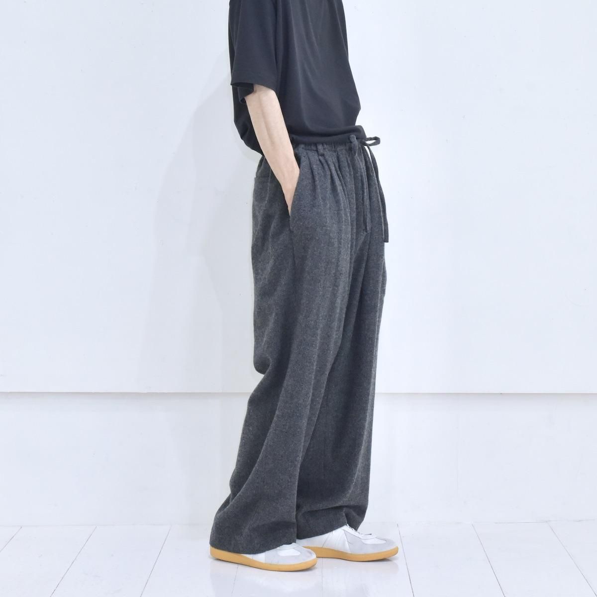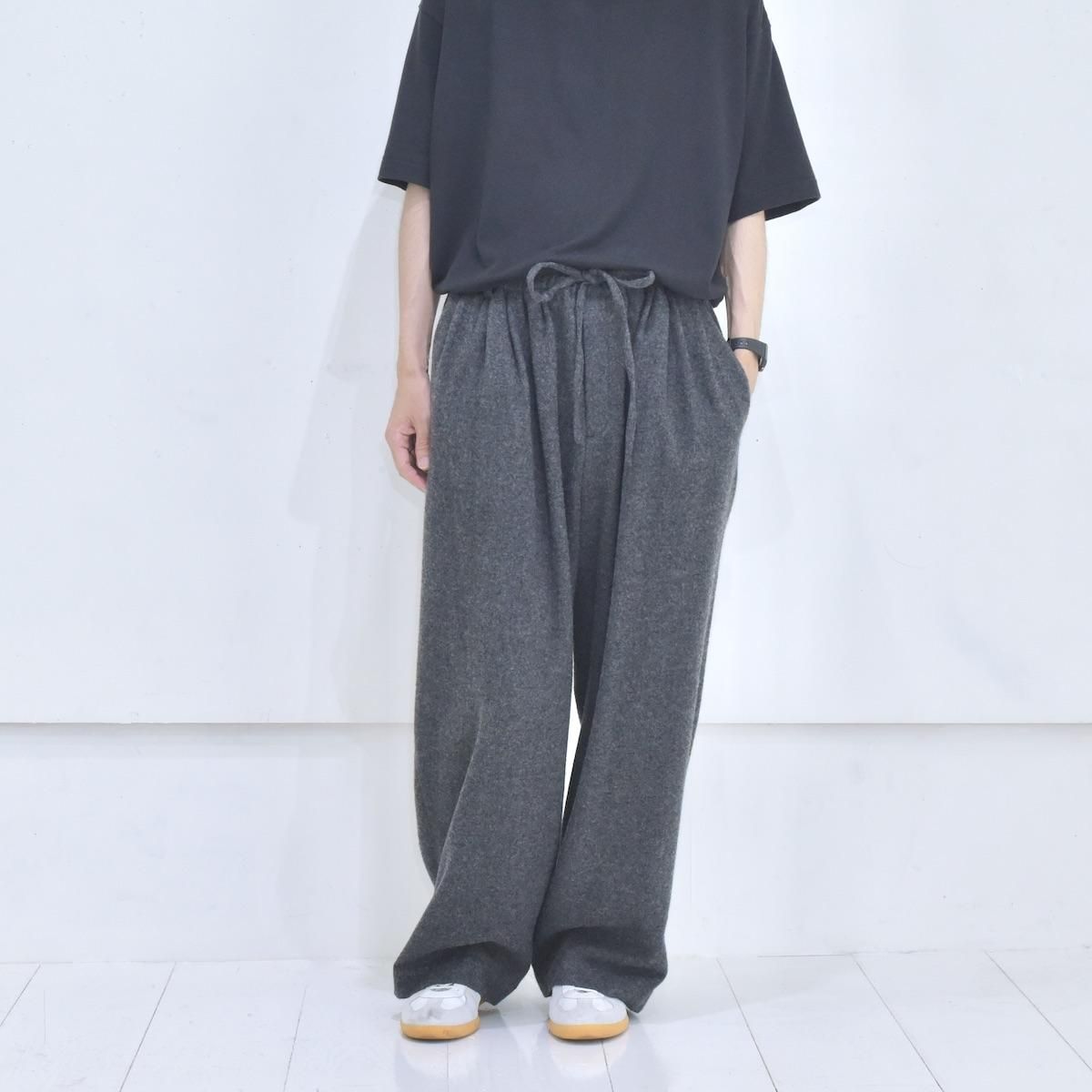 ホワイトカシミアとラムウールを原料とする尾州産のフランネルクロスで制作された"Wide Pants"。
