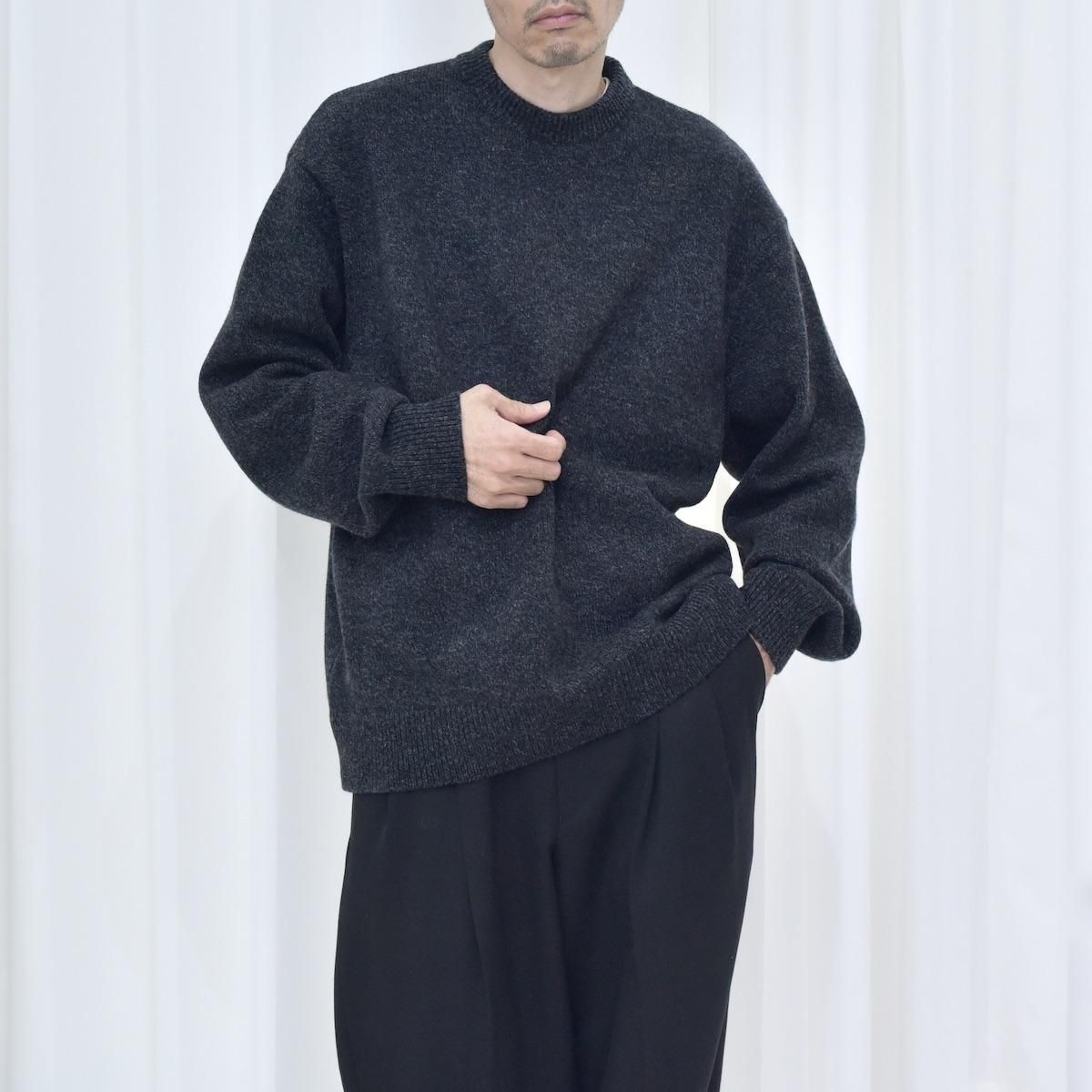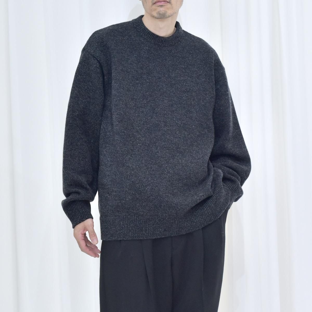 ラムウール糸を度詰め編みで編み立てて制作された"5G Lams Wool Crew Knit"。